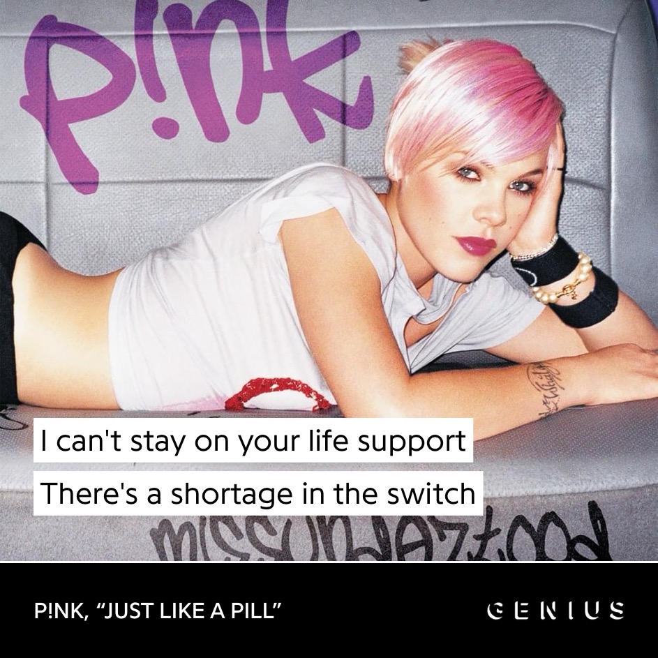 I TRIED TO CALL THE NURSE AGAIN, BUT SHE’S BEIN’ A LITTLE BITCH. “Just Like a Pill” and “Don’t Let Me Get Me” were a counterforce to teen pop. In M!ssundaztood’s second single, P!nk laments “Don’t want to be compared to damn Britney Spears. She’s so pretty; that just ain’t me.” P!nk has explained this lyric as not intended to throw shade on the teen pop singer but rather to state that P!nk viewed herself as an intentionally flawed star and that female singers didn’t have to fit into a Britney Spears mold. Furthermore, P!nk wanted to write songs discussing her life, some of which were never the subject of teen pop. In her fourth hit “Family Portrait,” P!nk talks about abuse and divorce, inspired by her childhood and the end of her parents’ marriage. In today’s song, “Just Like a Pill,” Moore talks about a former toxic relationship she had using the metaphor of the negative side effects of drugs to compare the relationship to. P!nk even talked about her past drug use, and the music video seemed more inspired by Nine Inch Nails than Christina Aguilera's early videos. It was grimier than a pop video at the time and featured P!nk licking her video boyfriend’s stomach. Britney and Christina would make videos similar to “Just Like a Pill,” but at that point, it would be hard to call their music of that era teen pop.